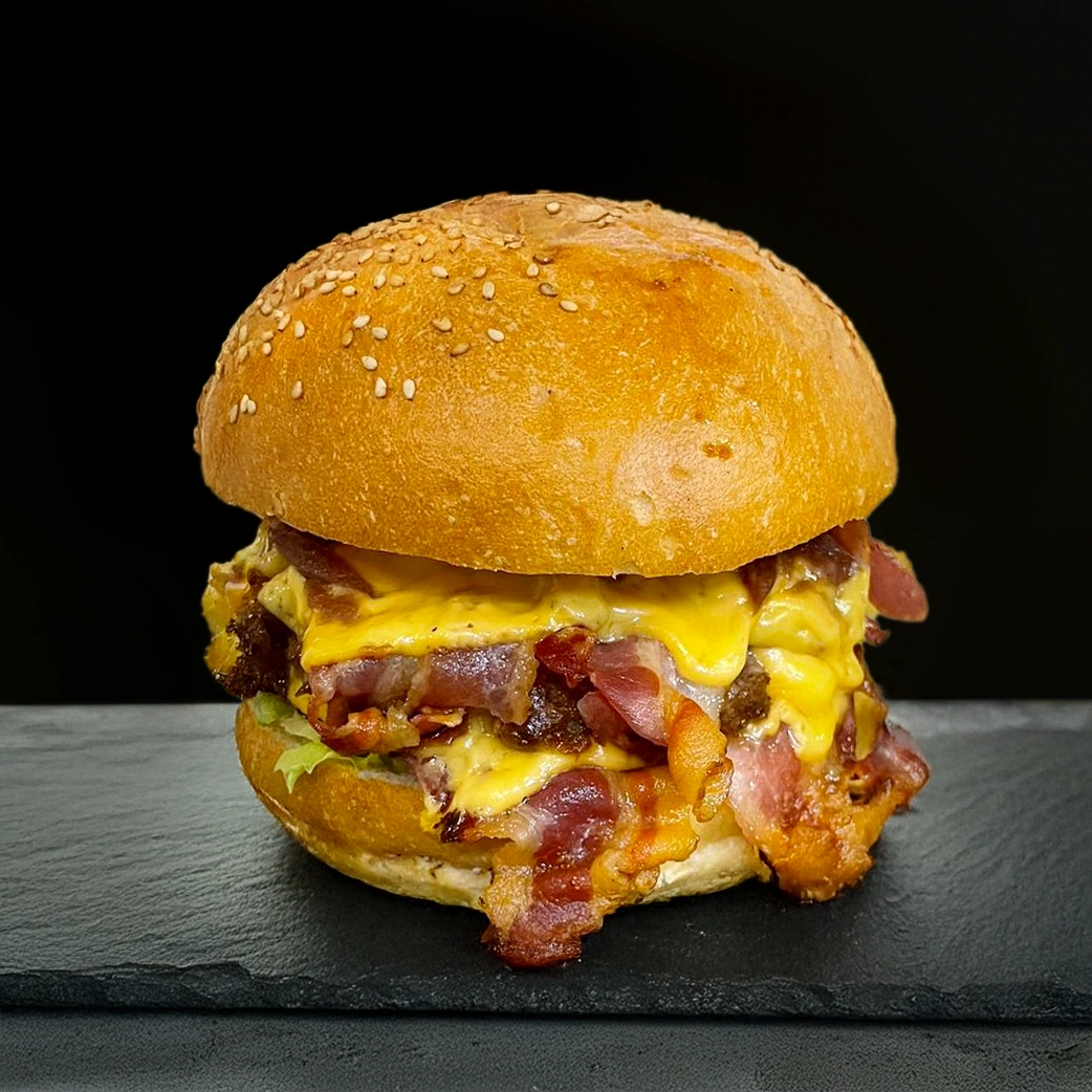 Doppio hamburger smash, doppio cheddar, doppio bacon, insalata, pomodoro, e salsa smash.
